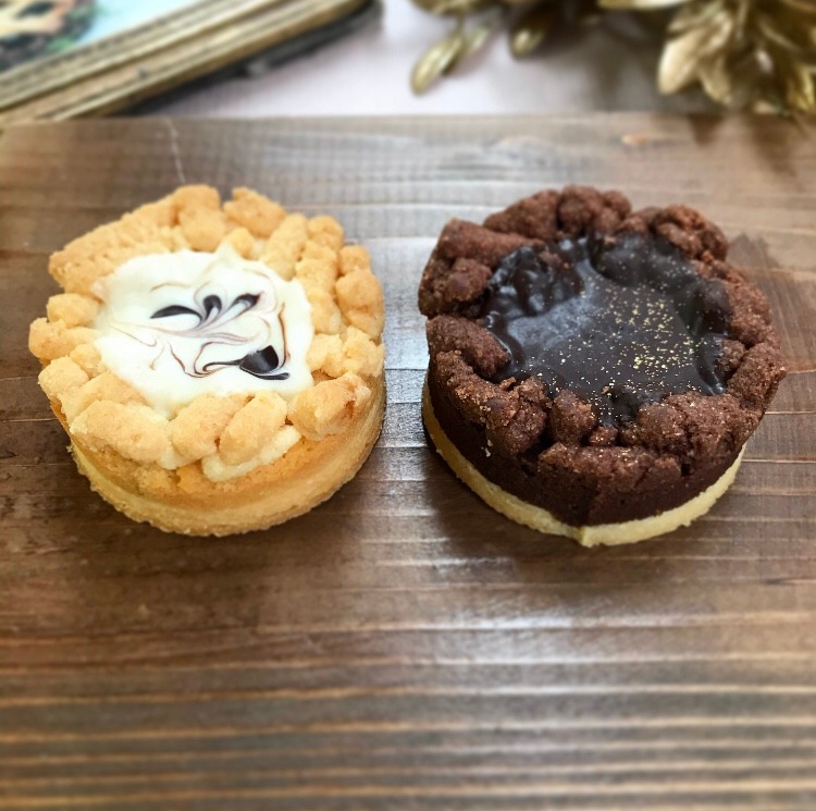 ・マーブルショコラ(写真手前)はアーモンドのタルト生地にチョコチップを練り込み、ホワイトチョコレートをかけて仕上げています。
